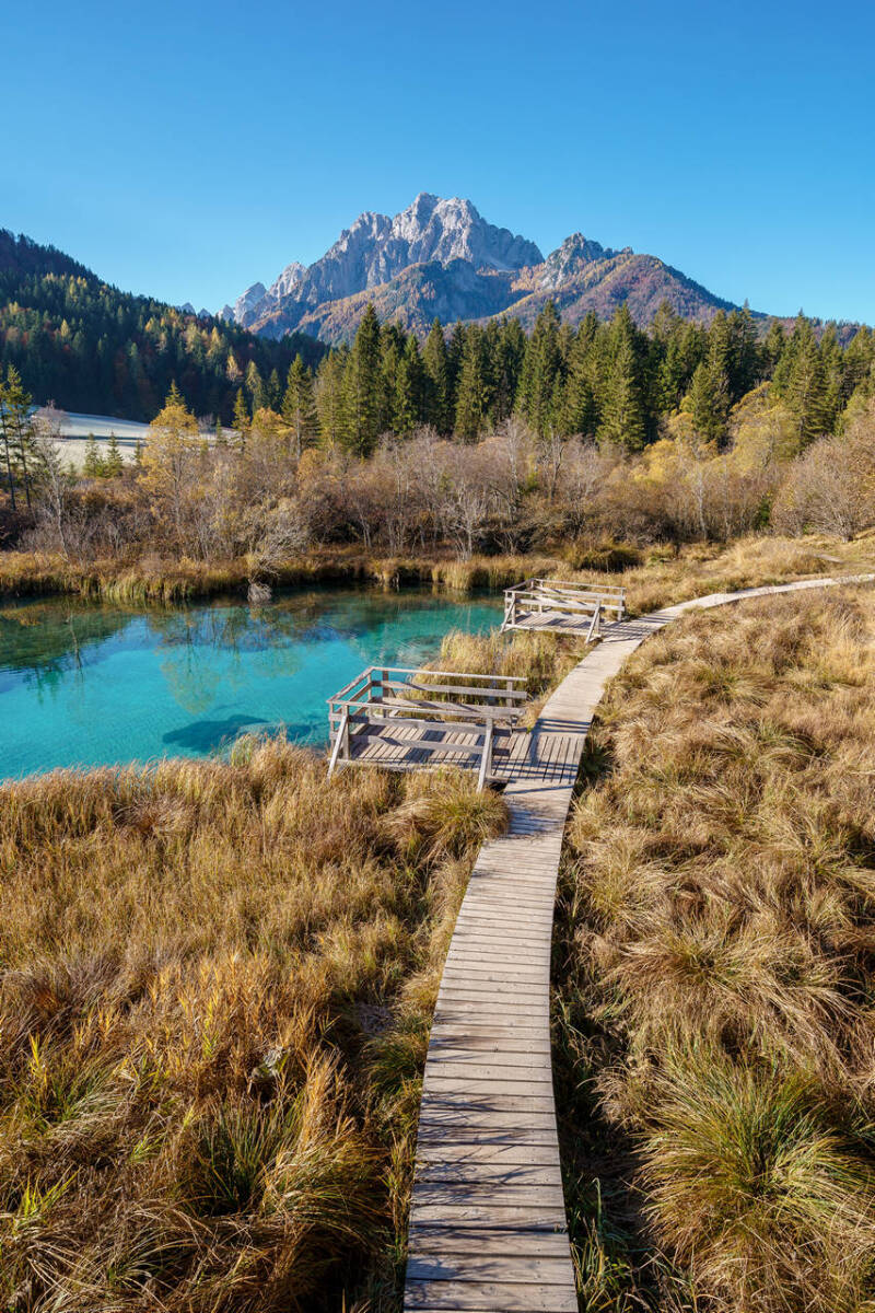 Special attention is given to Zelenci’s fragile ecosystem, where crystal-clear turquoise waters and delicate vegetation create a uniquely pristine atmosphere.