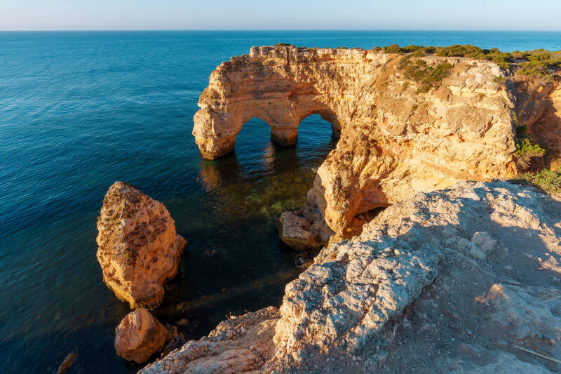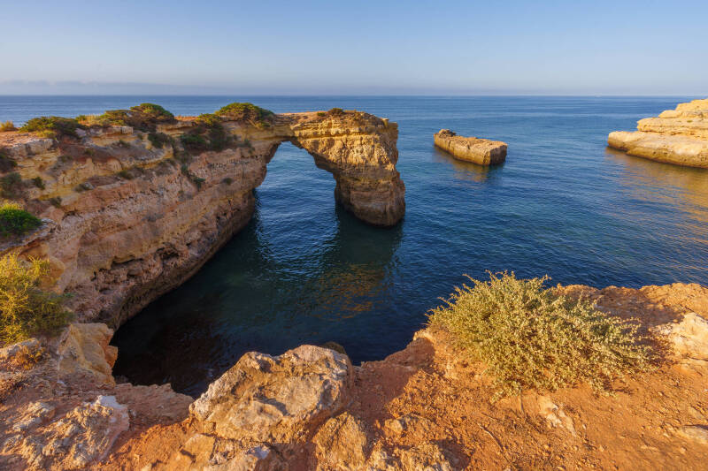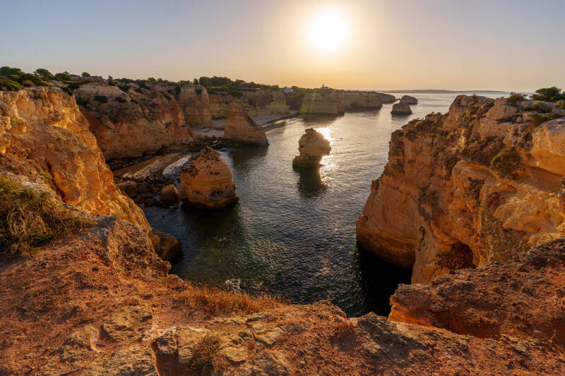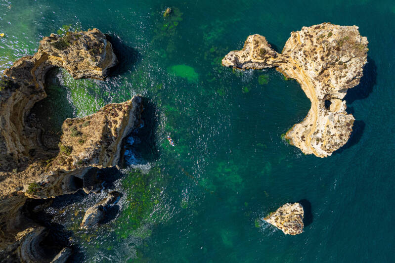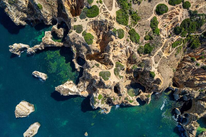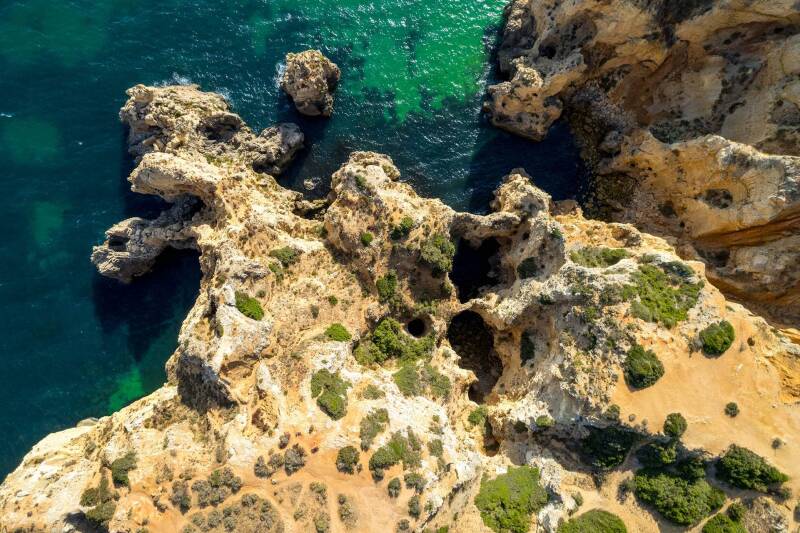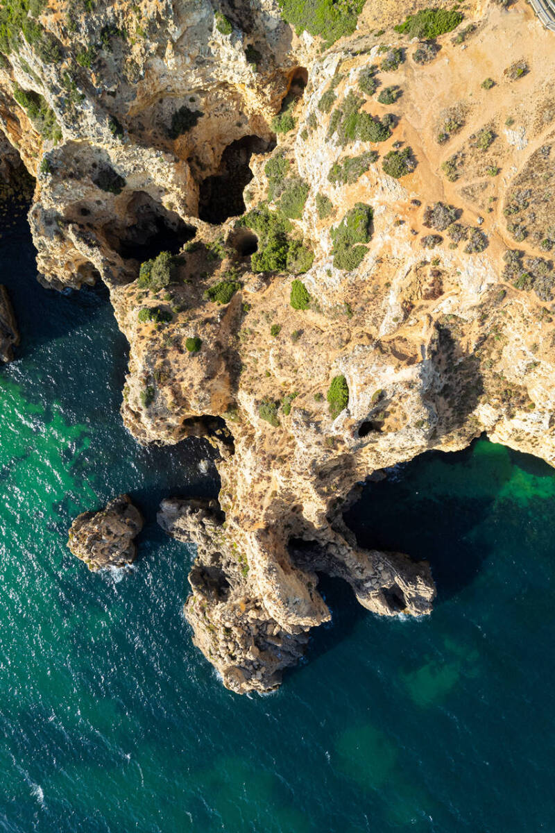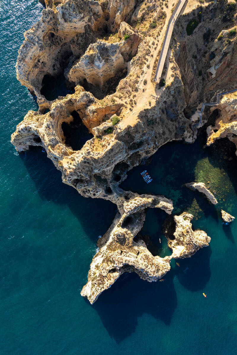 HU: Portugál tájkép fotózás, városi és tengerparti fotók Portugáliából, Algarve sziklás tengerpart, lagosi sziklafalak, tagolt atlanti partvidék, narancs- és sárga színű mészkősziklák, drónnal fotózott partvonal, légi tájfotók, történelmi városképek, portugál csempeművészet