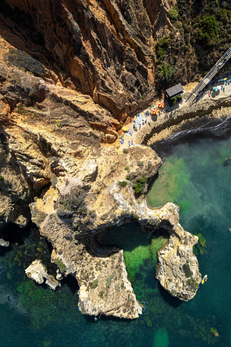 EN: Portugal photography, Lisbon tram photography, Rua da Bica, Porto riverside, Algarve coast, Algarve cliffs, Lagos cliffs, Atlantic coastline, dramatic coastal cliffs, orange limestone cliffs, yellow rock formations, aerial coastal photography, drone landscape photography, Sintra palaces, Évora Chapel of Bones, Aveiro gondolas, Portuguese azulejos, historic European cities, fine art travel photography